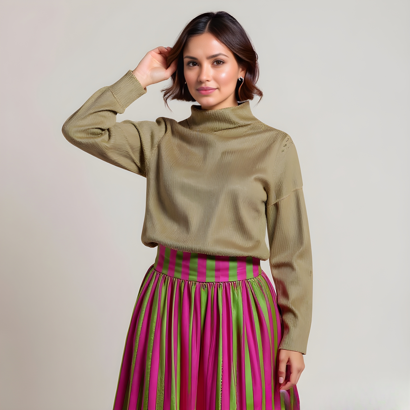 Entdecke unseren nachhaltigen One Size Midi-Rock Nani – perfekt für alle, die vielseitige, faire und bequeme Mode lieben. Der Rock überzeugt durch sein modernes Streifenmuster und seine zeitlose Midi-Länge, die deine Beine elegant umspielt und sowohl sportlich als auch elegant getragen werden kann.